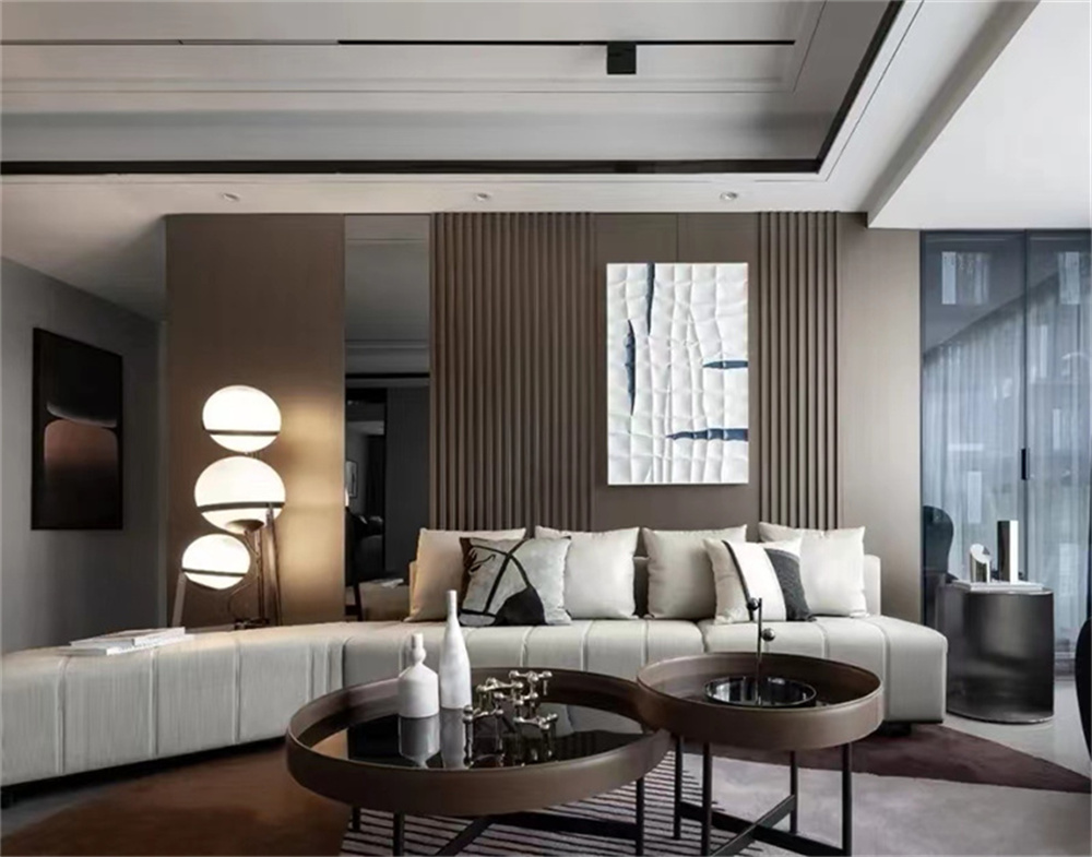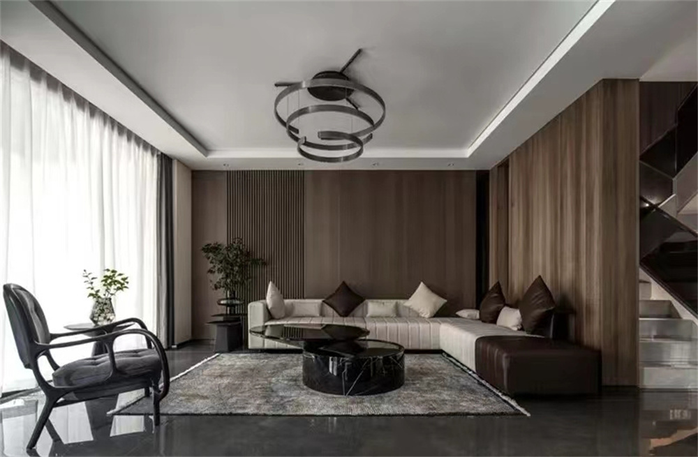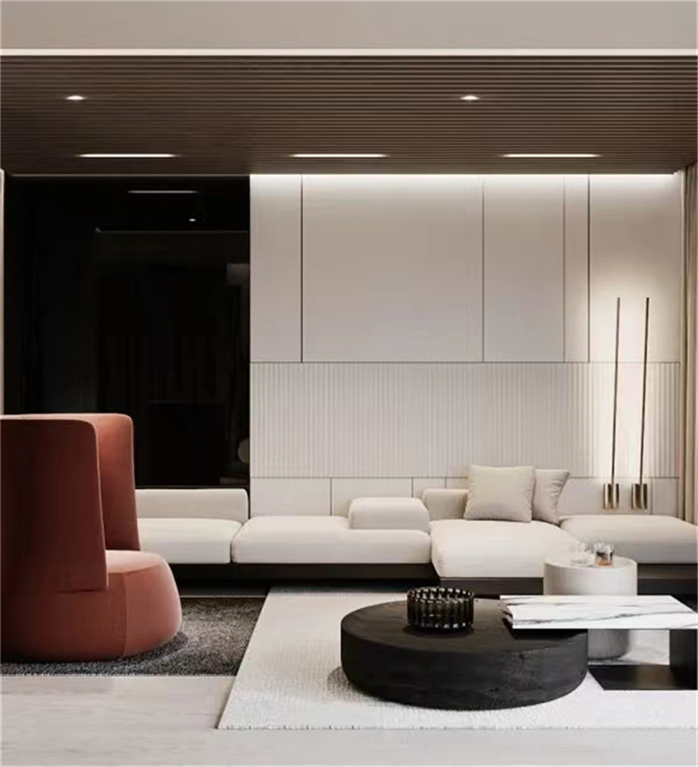 Staggered collision, order in disorder, chic and temperament, adding grille embedded lights, the space is neat and soft.Extending from the ceiling to the large floor-to-ceiling window curtain wall, like a bead curtain, the light passes through the glass door and enters the room, reflecting on the room, gently rippling.